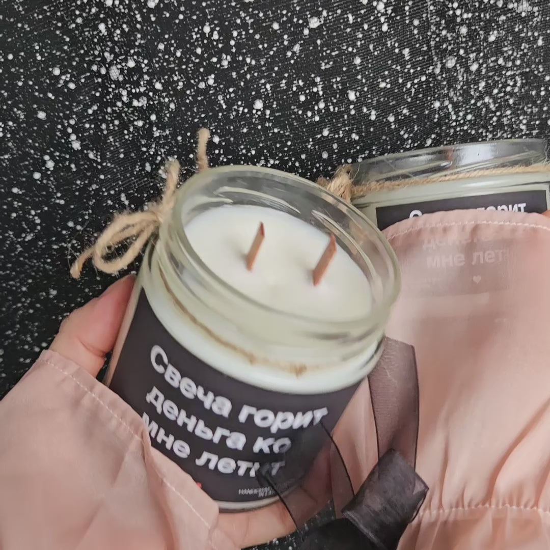 Ручная работа из 100% натурального соевого воска с деревянным фитилём, который приятно потрескивает при горении, создавая атмосферу уюта и притяжения денег 💸